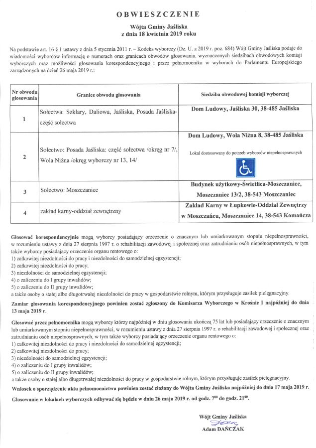 OBWIESZCZENIE Wójta Gminy Jaśliska z dnia 18 kwietnia 2019 roku o numerach oraz granicach obwodów głosowania, wyznaczonych siedzibach obwodowych komisji wyborczych oraz mozliwości głosowania korespondencyjnego i przez pełnomocnika w wyborach do Parlamentu Europejskiego zarzadzonych na dzień 26 maja 2019 r. (PDF)